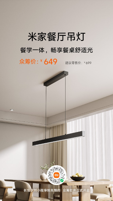 9月24日上午10点,小米商城小米有品正式开启众筹,众筹到手价649,建议零售价799。米家餐厅吊灯,餐学一体,畅享餐桌舒适光。