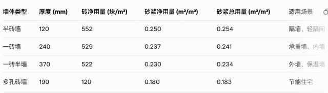1. 墙体厚度:半砖墙(隔墙)砂浆用量较高,约0.25m³;一砖墙(承重)约0.237m³;一砖半墙约0.23m³。厚墙砖数多,砂浆相对少。