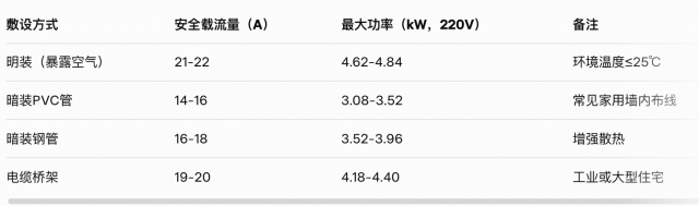 从表中可见,明装条件下载流量最高,达21A,对应功率约4.6kW。 但暗装PVC管时,由于热量不易散发,载流量降至14A,功率仅3kW左右。 这反映了敷设方式的核心影响:明装散热自由,暗装需扣减20%-30%。