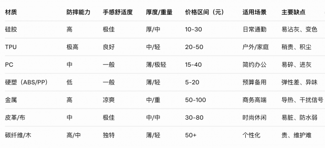• 通勤族:TPU或硅胶,防滑耐摔不累赘。